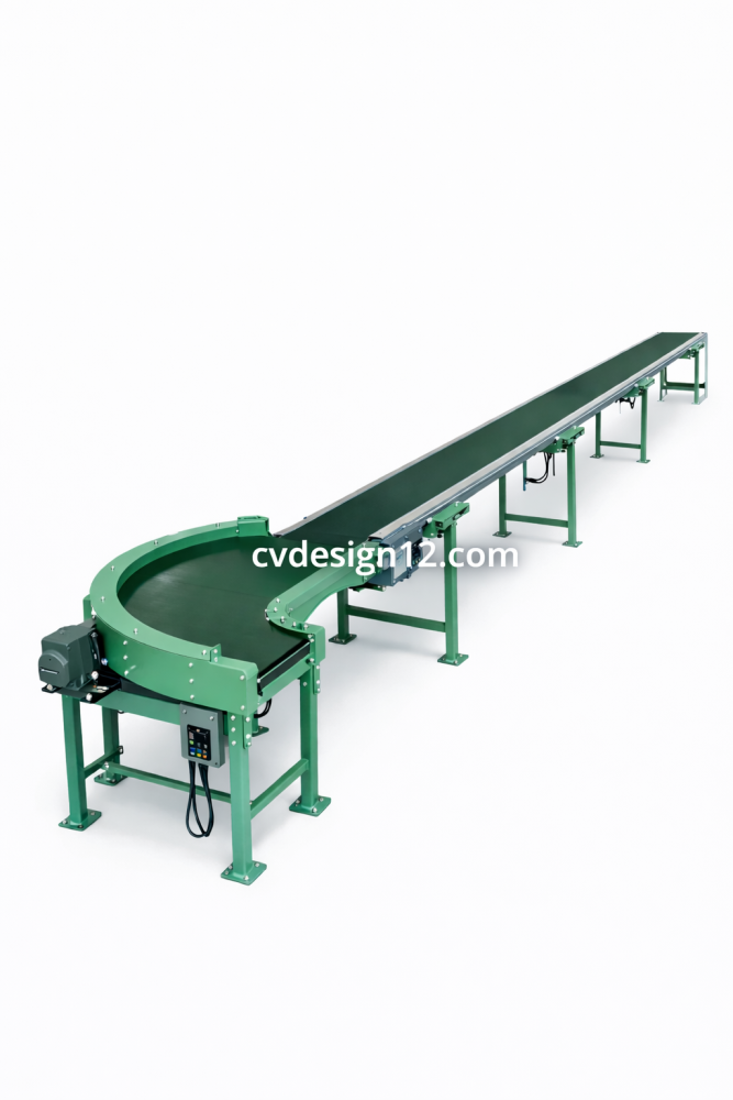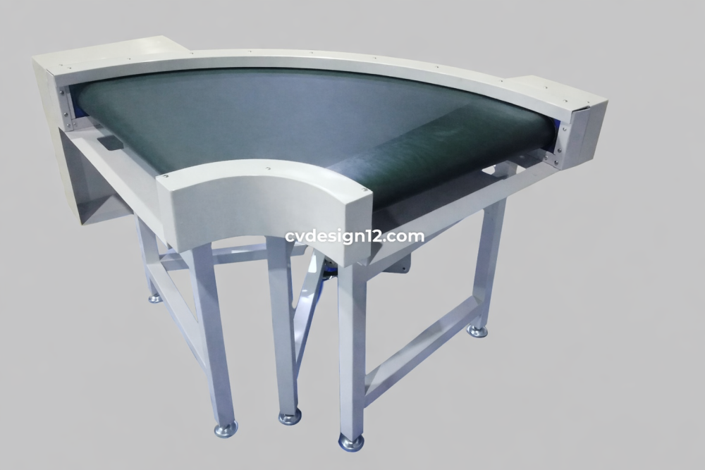 Conveyor ที่ออกแบบให้ “เปลี่ยนทิศทางการลำเลียง” จากแนวตรงไปเป็นแนวโค้ง เช่น โค้ง 30°, 45°, 90°, หรือ 180° ใช้เมื่อต้องการให้สินค้าเลี้ยวไปอีกทิศทางโดยไม่ต้องยกลงจากสายพาน